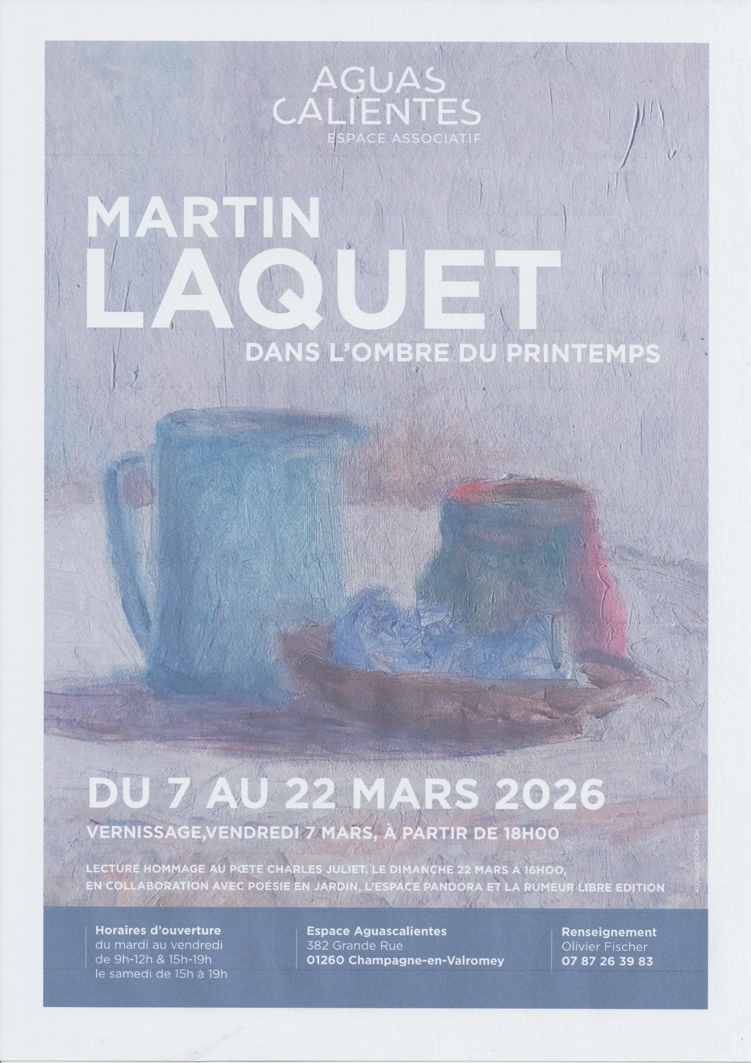 Le finissage, le dimanche 22 mars, avec une lecture hommage à Charles Juliet, en partenariat avec Poésie en jardin, l'Espace Pandora et La rumeur libre édition, dans le cadre du Magnifique Printemps, à partir de 16 h